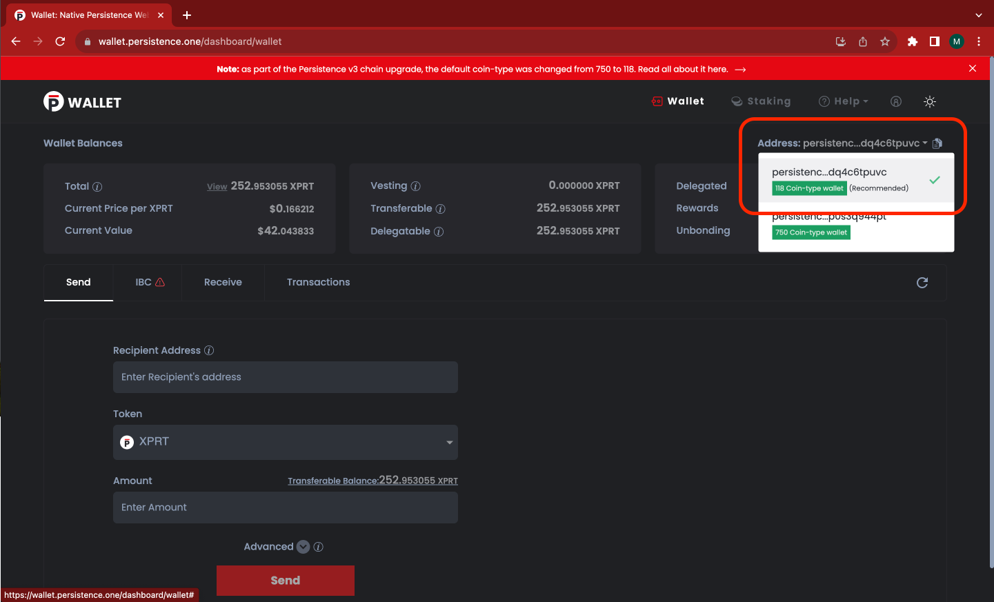 To see both coin-type addresses in your persistence wallet, you need to login using Keystore file.